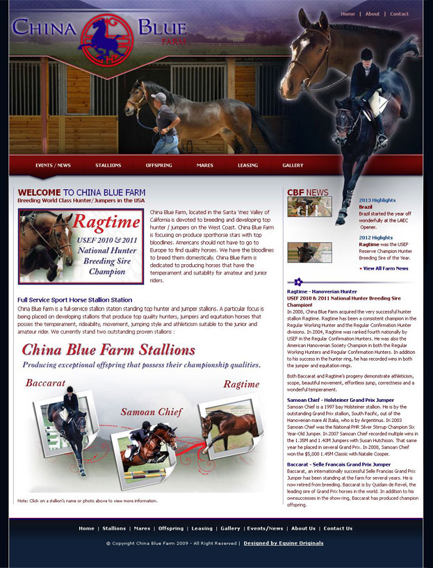 China Blue Farm, located in the Santa Ynez Valley of California is devoted to breeding and developing top hunter / jumpers on the West Coast. China Blue Farm is focusing on produce sporthorse stars with top bloodlines. Americans should not have to go to Europe to find quality horses. China Blue Farm is dedicated to produce horses that have the temperament and suitability for amateur and junior riders.
