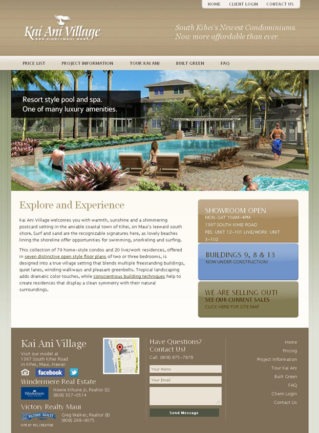 Kai Ani Village in Kihei Maui is a collection of 79 new condos and 20 live/work residences, offered in seven distinctive open style floor plans that blends multiple freestanding buildings, quiet lanes and pleasant greenbelts.